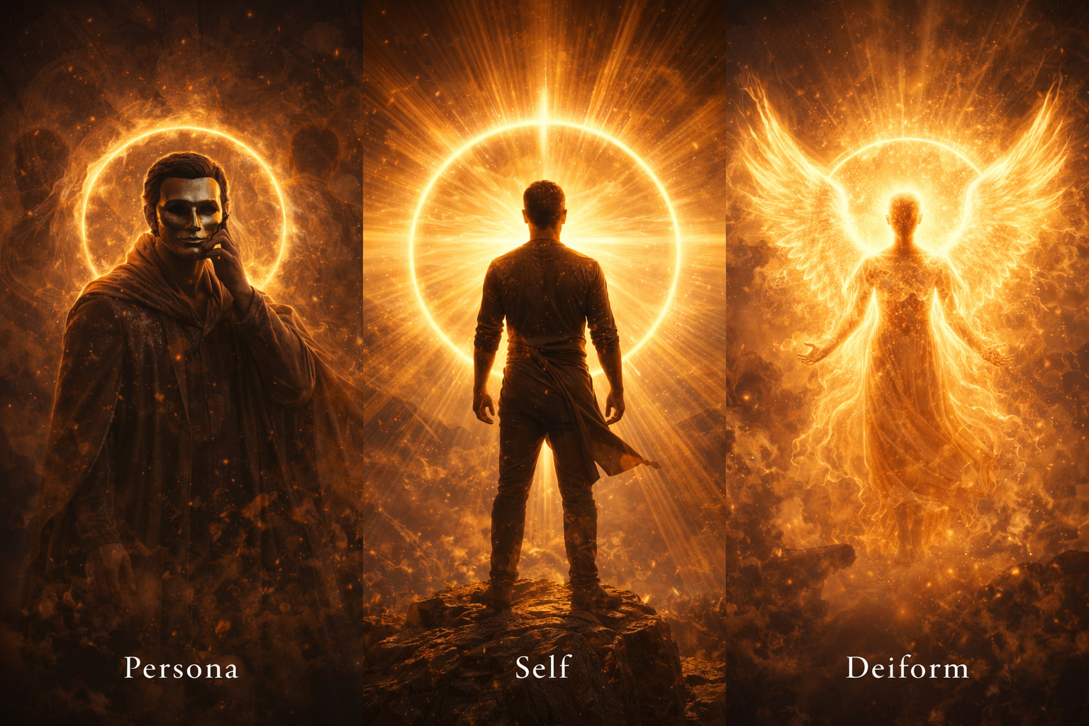 The movement from Persona → Self → Deiform mirrors the transition from unconscious participation to conscious authorship.
